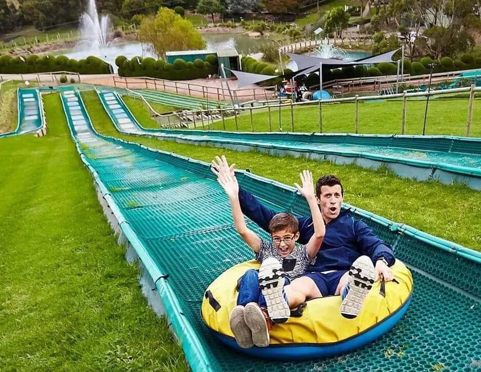 还有挑战胆识的管道滑梯。从陡俏道急速向下滑,途经一个人工滑雪道,体验一把速度与激情!