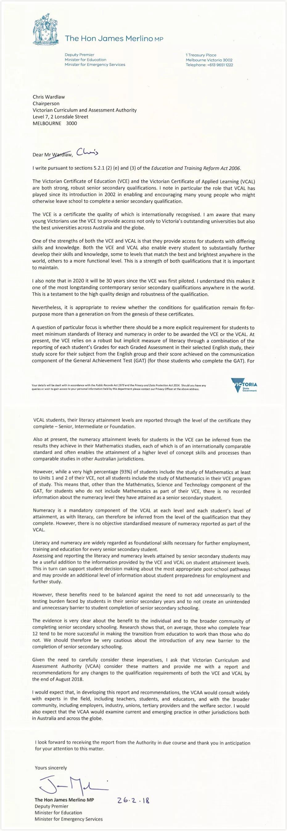 在写给澳大利亚维多利亚课程考评局主席沃德洛(Chris Wardlaw)的信中,梅利诺写道:“现在我们有一个需要特别关注的问题,那就是我们是否要有一个更明确的标准来要求学生满足最低标准的读写能力和数学计算能力。”